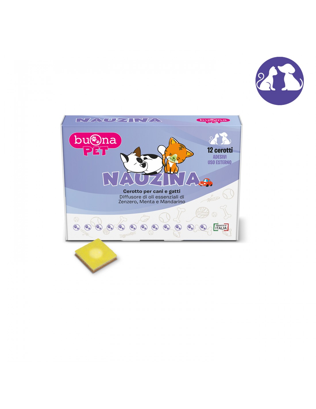 NAUZINA è un cerotto per uso esterno da applicare sul collare del cane o nel trasportino del gatto, diffusore di oli essenziali di Zenzero, Menta e Mandarino.